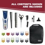 Wahl Color Pro Cordless Haircutting Kit features a rechargeable cord/cordless clipper with a full set of color coded attachment guards to make haircutting quick and easy. The convenient color code guides help make it easy to identify the right size guard color. The clipper has a powerful, long-lasting rechargeable battery with a run time of up to 60 minutes and can be used with or without a cord. The blades are also stainless steel and removable to provide outstanding cutting performance.